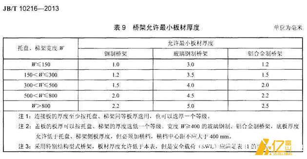 根據(jù)《鋼制電纜橋架工程技術規(guī)程》編號:T/CECS31-2017-3.5.5章規(guī)定,熱浸鋅橋架厚度標準參考如下: